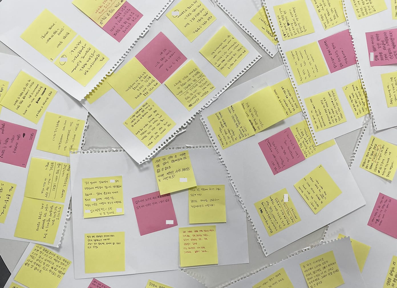 진행 방식은 이랬어요. 각자 스케치북에 자신의 고민을 적고, 롤링페이퍼처럼 돌아가면서 다른 팀원들의 고민을 읽고 아이디어나 조언을 적어주는 거예요. 작은 팀 단위로 나누어 진행했기 때문에 더 편안하게 속마음을 나눌 수 있었죠.