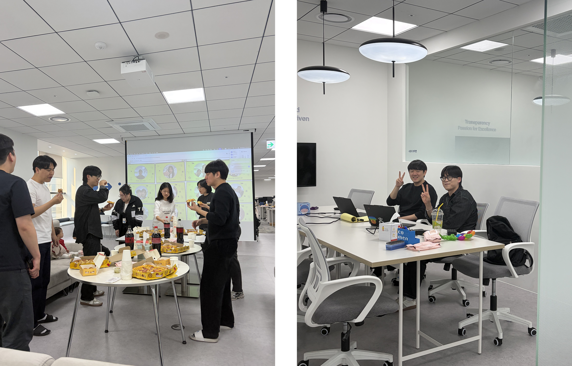 작은 이벤트가 끝난 후엔 피자 타임! 동료들과 맛있는 피자를 먹으며 에너지를 보충했습니다. 배를 채운 우리는 다시 각자의 노트북 앞으로 돌아가 9시까지 달렸습니다. 역대 가장 짧은 해코톤인 만큼 12시간을 모두 알차게 썼고 우리는 월요일에 다시 만나 수상자를 가리기로 했어요!